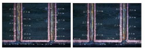 測(cè)試板成品量測(cè)所有電阻均合格,說(shuō)明板電銅厚控制21+/-3um、成品銅厚控制均值35um到40多um,線寬控制在0.19到0.21之間,成品電阻合格。且蝕刻后的半成品電阻比成品的電阻大1.5Ω左右。故蝕刻量測(cè)電阻理論上應(yīng)做1.5Ω的預(yù)大。預(yù)大與PCB的設(shè)計(jì)和阻焊和表面處理流程帶來(lái)的差異有相當(dāng)大的關(guān)系,不同PCB蝕刻后的電阻預(yù)大需要考慮到這些因素。