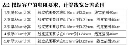 面銅控制中值在35um,則實(shí)際完成銅厚在30到40um之間,根據(jù)客戶的電阻要求,計(jì)算線寬公差范圍如下表2,根據(jù)下表計(jì)算結(jié)果,控制銅厚理論優(yōu)區(qū)間32到40um之間。