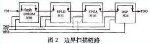 在此目標板上,我們將Flash EPROM(N30)、DSP(N31)、EPLD(N14)和FPGA(N24)依次連接起來,成為一個完整的掃描鏈路。TAP控制信號(TCK、TMS、TRST*)并聯,前一器件的TDO和后一器件的TDI依次連接成鏈。其中只有DSP有TRST*信號。對于TRST*信號,因為它是低電平有效,若在器件內部或者電路板上已經上拉,則在測試時可以不加以控制。而在該目標板的DSP內部此引腳處于下拉狀態,為使其進人邊界掃描狀態,必須外加激勵信號,因此本文把它單獨引出來。如圖2所示。